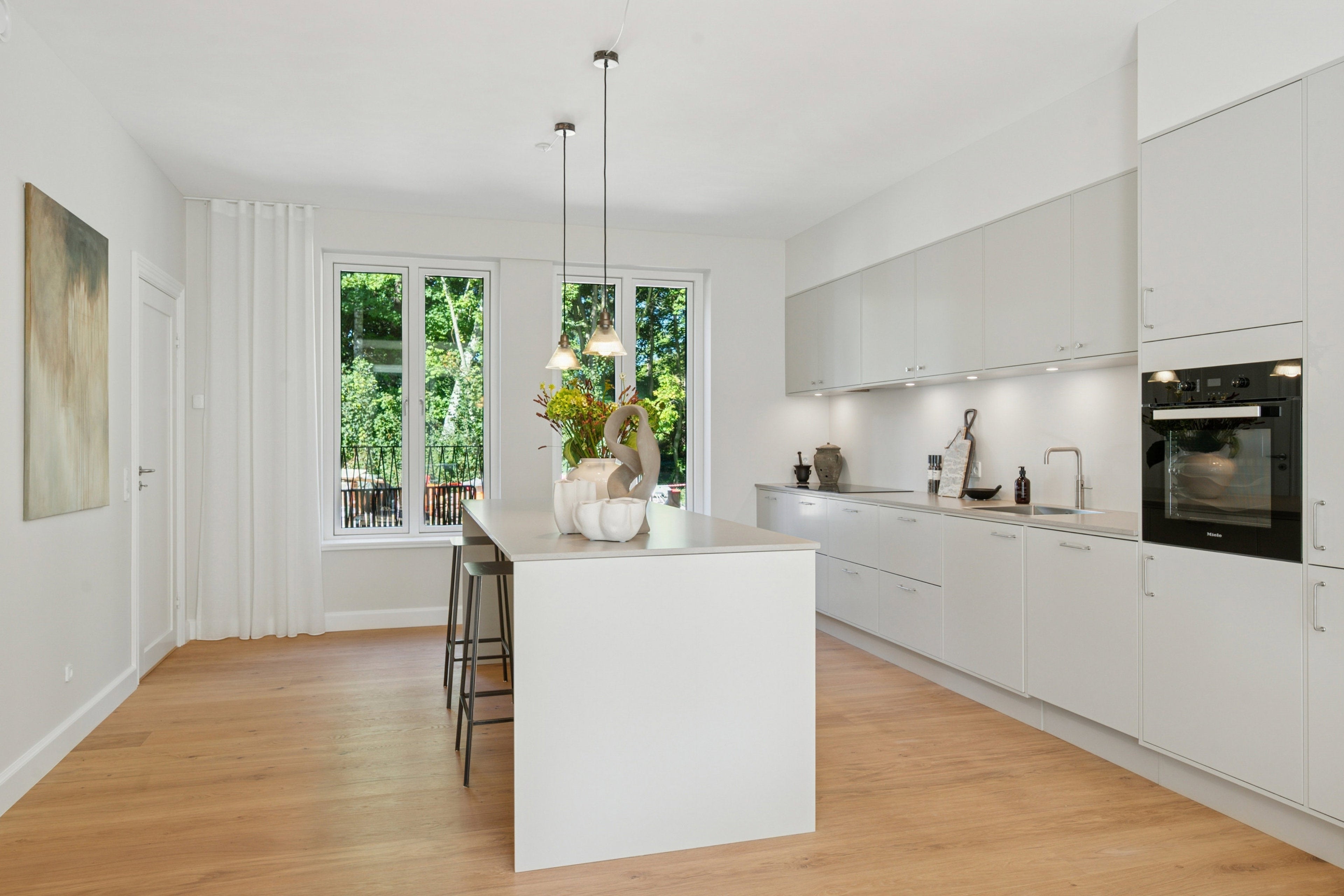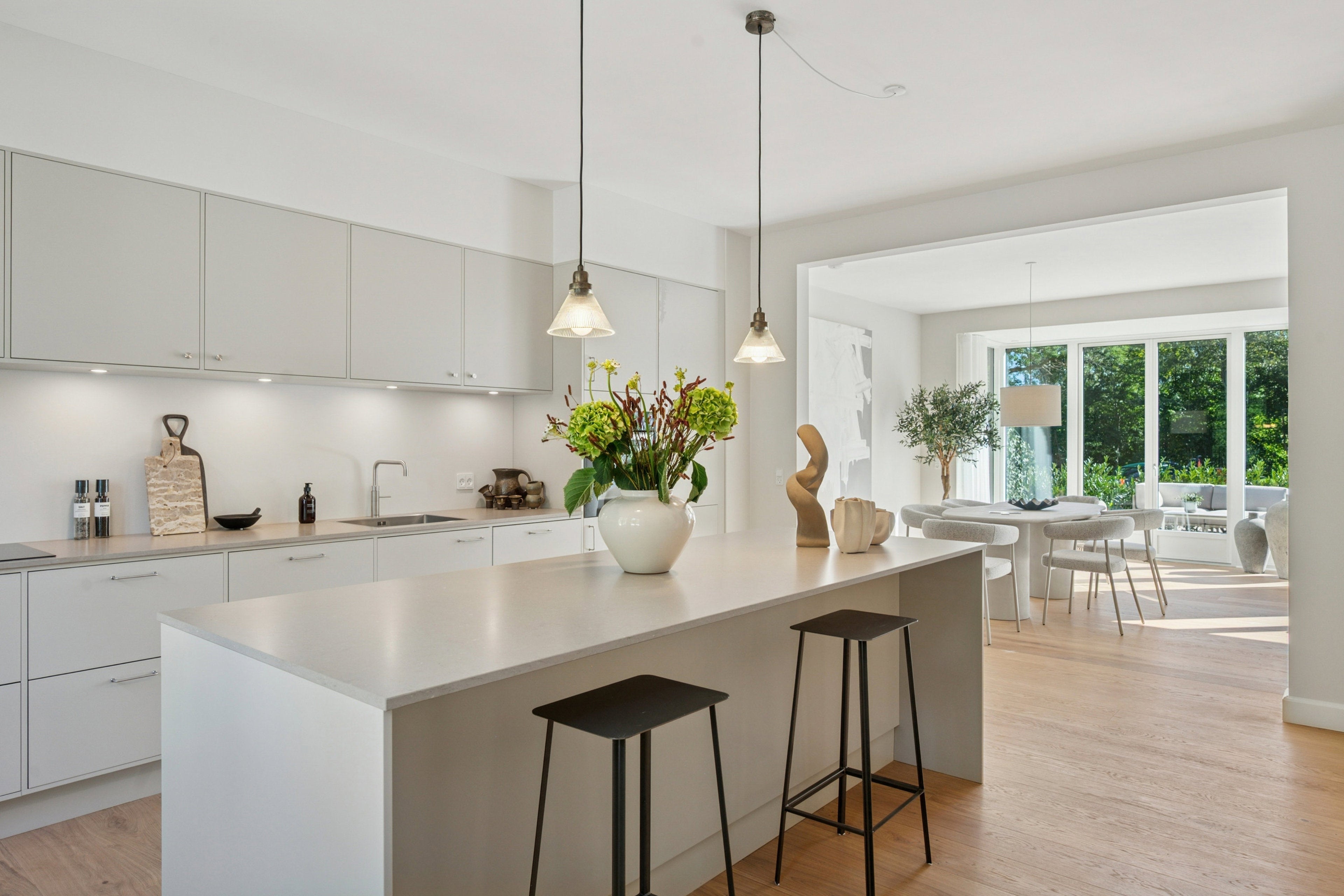 Dette moderne køkken er indrettet med fokus på lys, funktionalitet og skandinavisk minimalisme. Den åbne køkkenløsning med køkkenø skaber et naturligt samlingspunkt i boligen og giver både arbejdsplads og socialt rum i ét. De lyse fronter, rene linjer og varme trægulve giver en elegant kontrast, mens nøje udvalgte detaljer og styling skaber en rolig og indbydende atmosfære. Resultatet er et tidløst og eksklusivt køkkenmiljø, der understøtter boligens arkitektur og fremhæver rummets naturlige lysindfald.