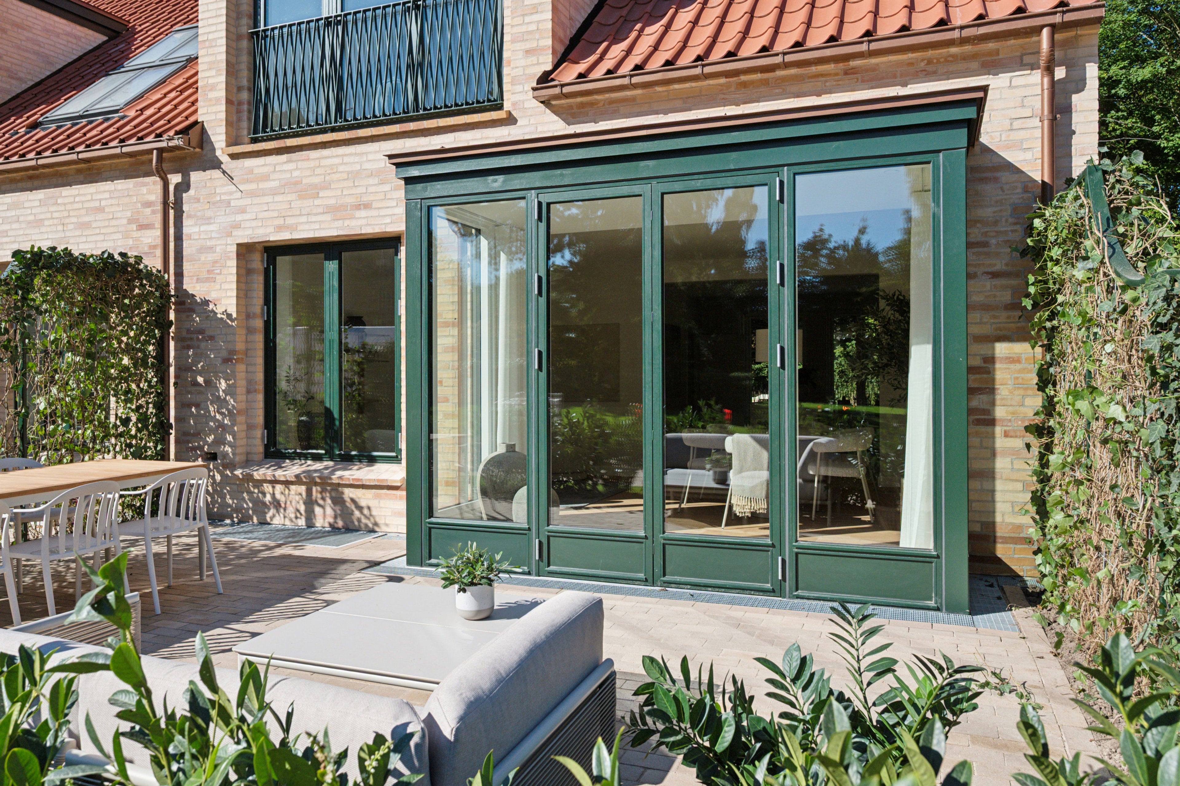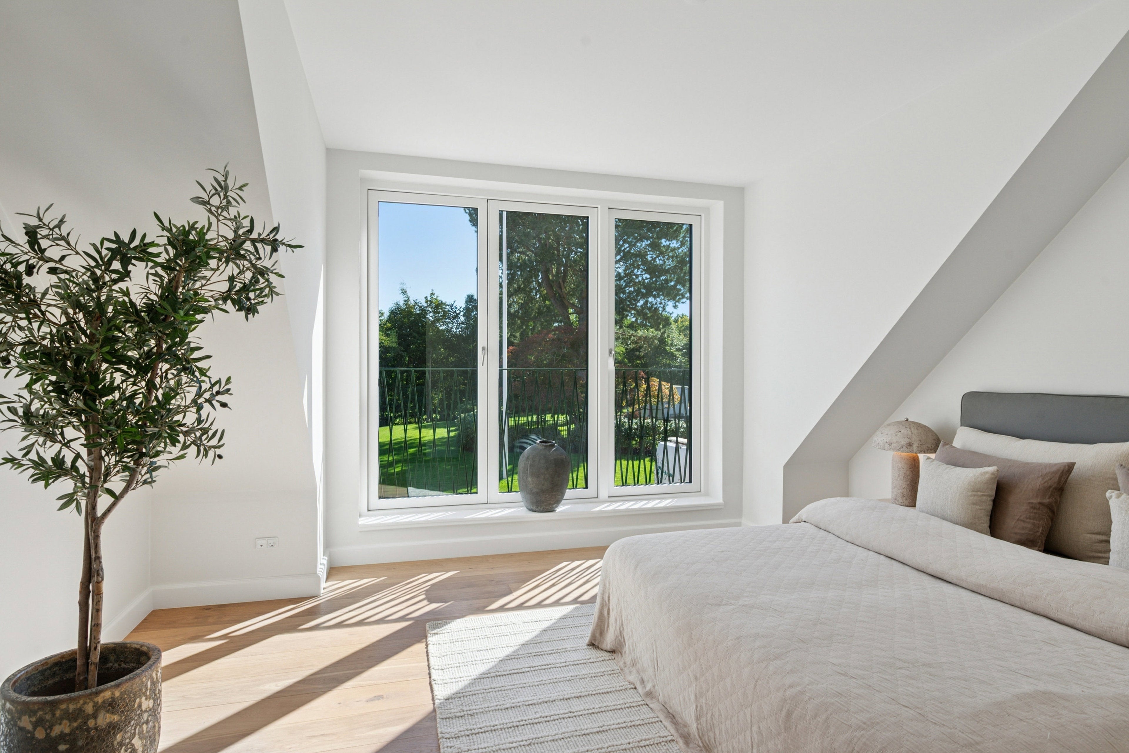 Boligens uderum er indrettet med fokus på sammenhæng mellem bolig og natur, hvor terrasse og opholdszone inviterer til afslapning og samvær. De store vinduespartier skaber en flydende overgang mellem inde- og udeliv, mens møbler og grønne elementer understøtter en varm og indbydende stemning. Terrassen er stylet, så den fremstår som en naturlig forlængelse af boligens indretning – et sted hvor man kan nyde solen, udsigten og de grønne omgivelser. Resultatet er et harmonisk og attraktivt uderum, der fremhæver boligens livskvalitet og arkitektur.