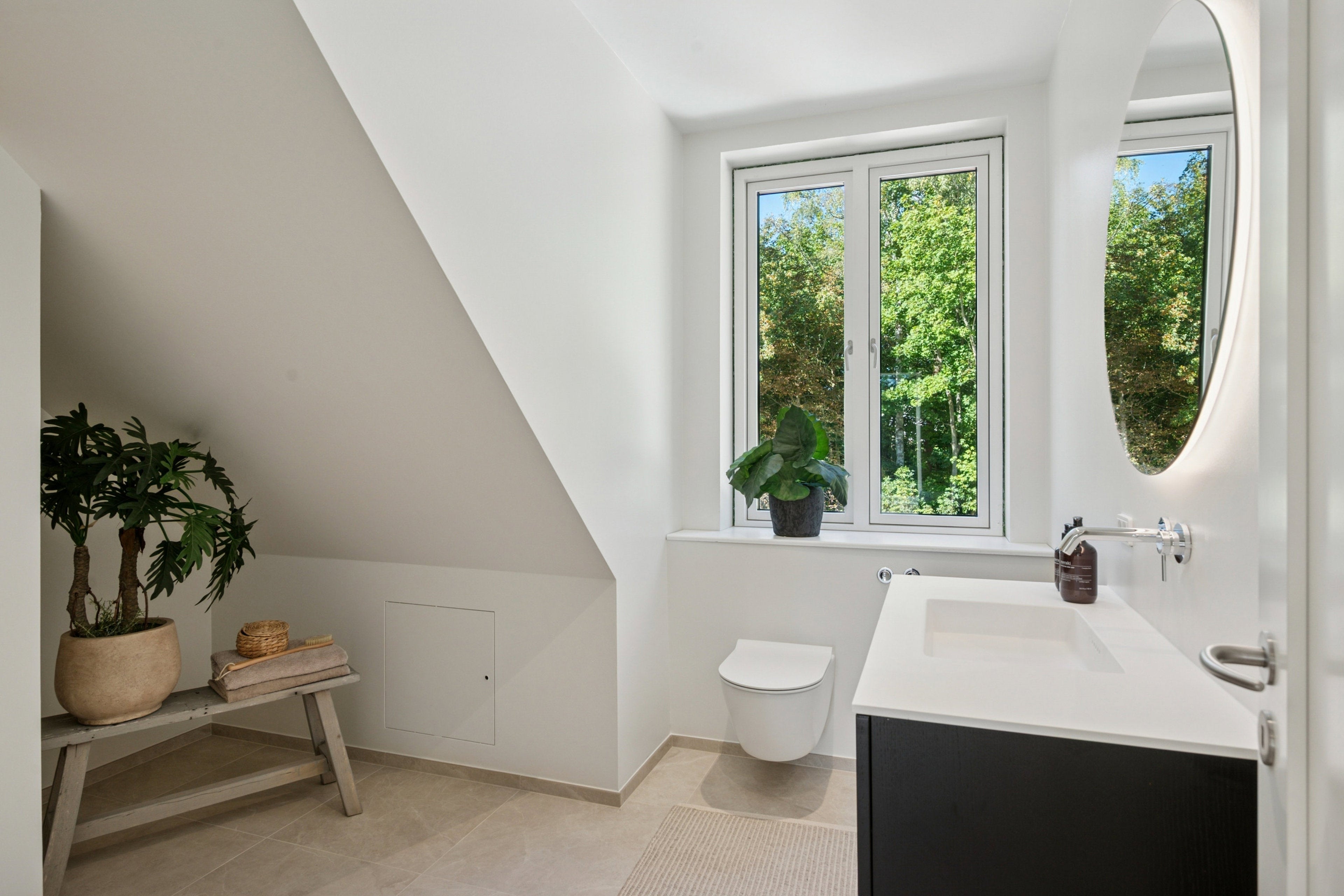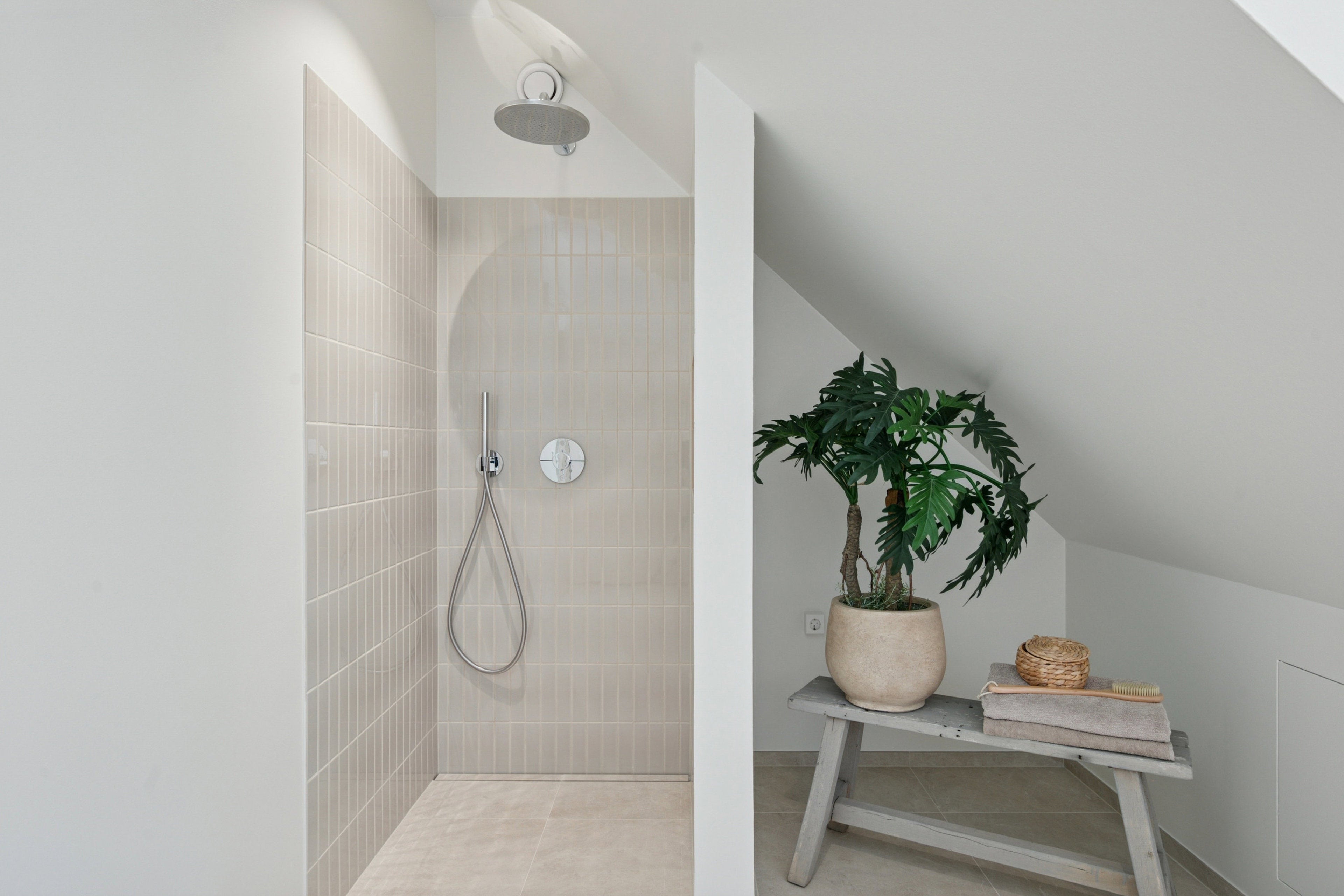 Badeværelset er stylet med fokus på eksklusive materialer, enkle linjer og rolige farvetoner, der skaber en spa-lignende stemning. De stilrene overflader kombineret med varme, naturlige elementer giver rummet en følelse af luksus og balance. Små stylingdetaljer – som tekstiler, planter og keramik – tilføjer personlighed og fremhæver rummets arkitektoniske kvaliteter. Resultatet er et moderne badeværelse med en afslappende og indbydende atmosfære, hvor funktionalitet og æstetik går hånd i hånd.
