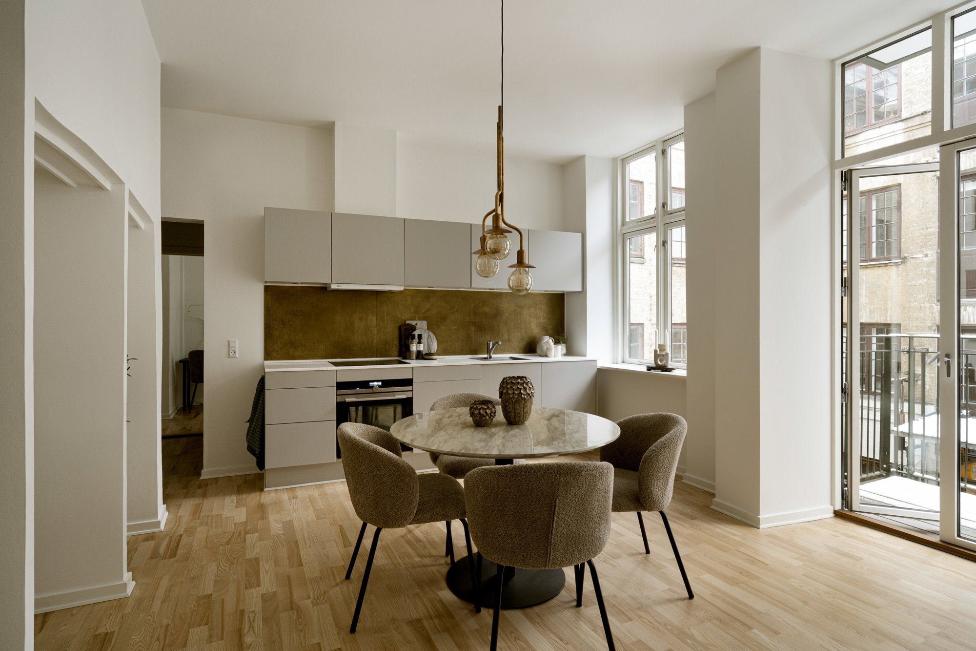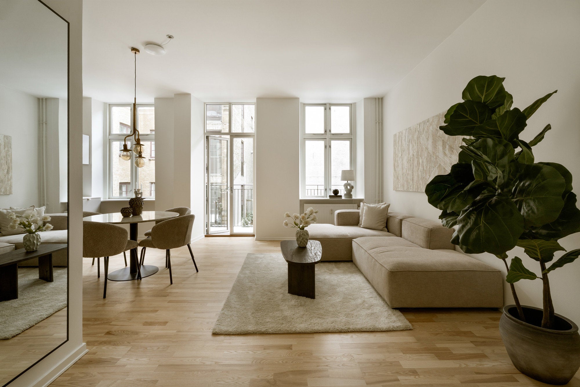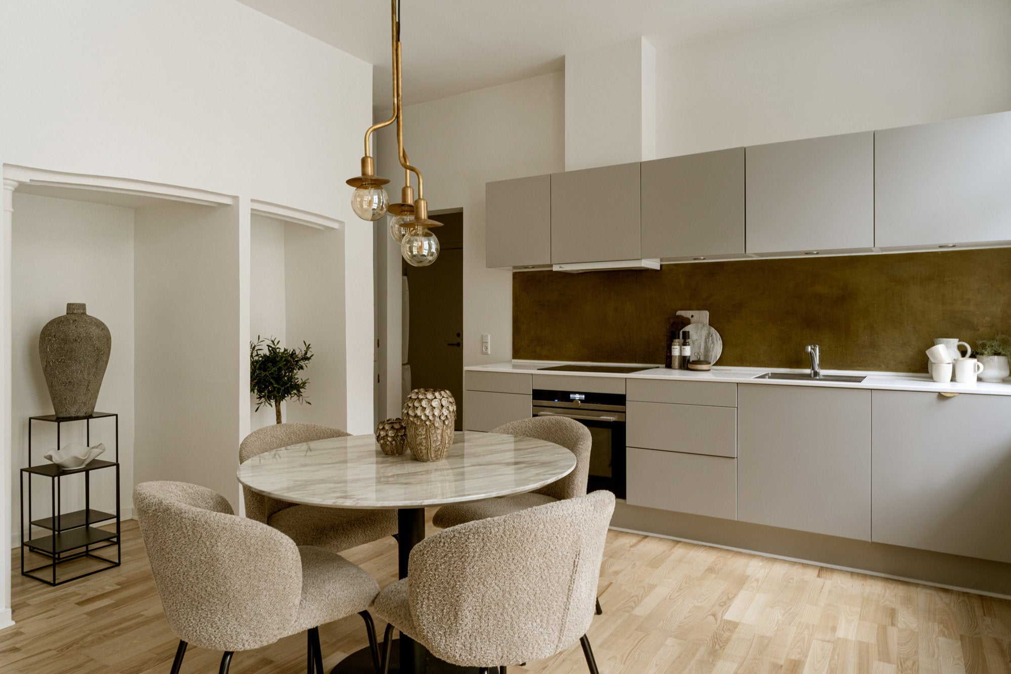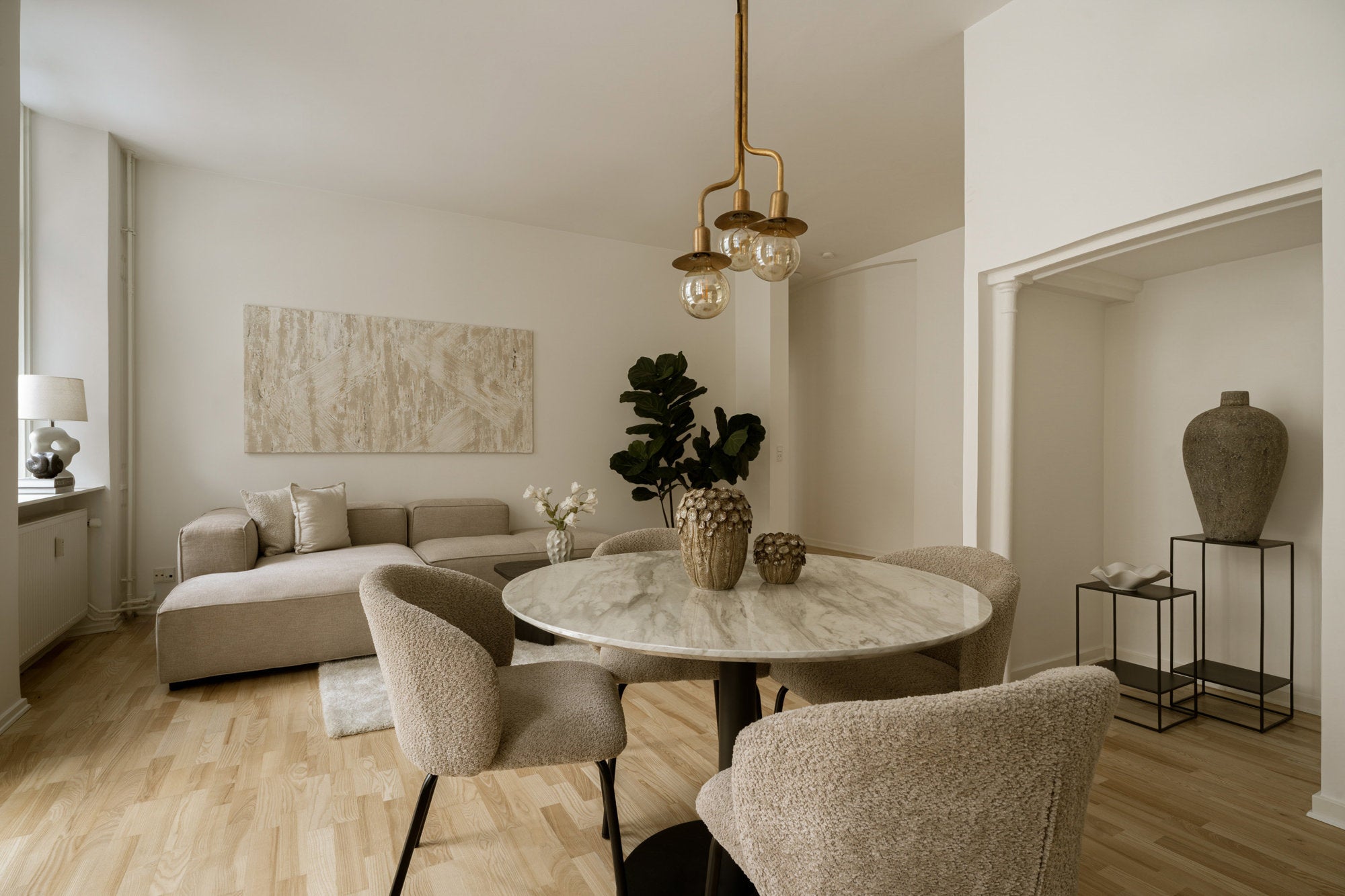 Stue og køkken er stylet i en åben og harmonisk helhed med fokus på naturligt lys, rene linjer og varme materialer. De bløde former, afdæmpede farver og nøje udvalgte møbler skaber en moderne og indbydende atmosfære. En gennemtænkt styling, der fremhæver rummets rumfornemmelse og funktionalitet.