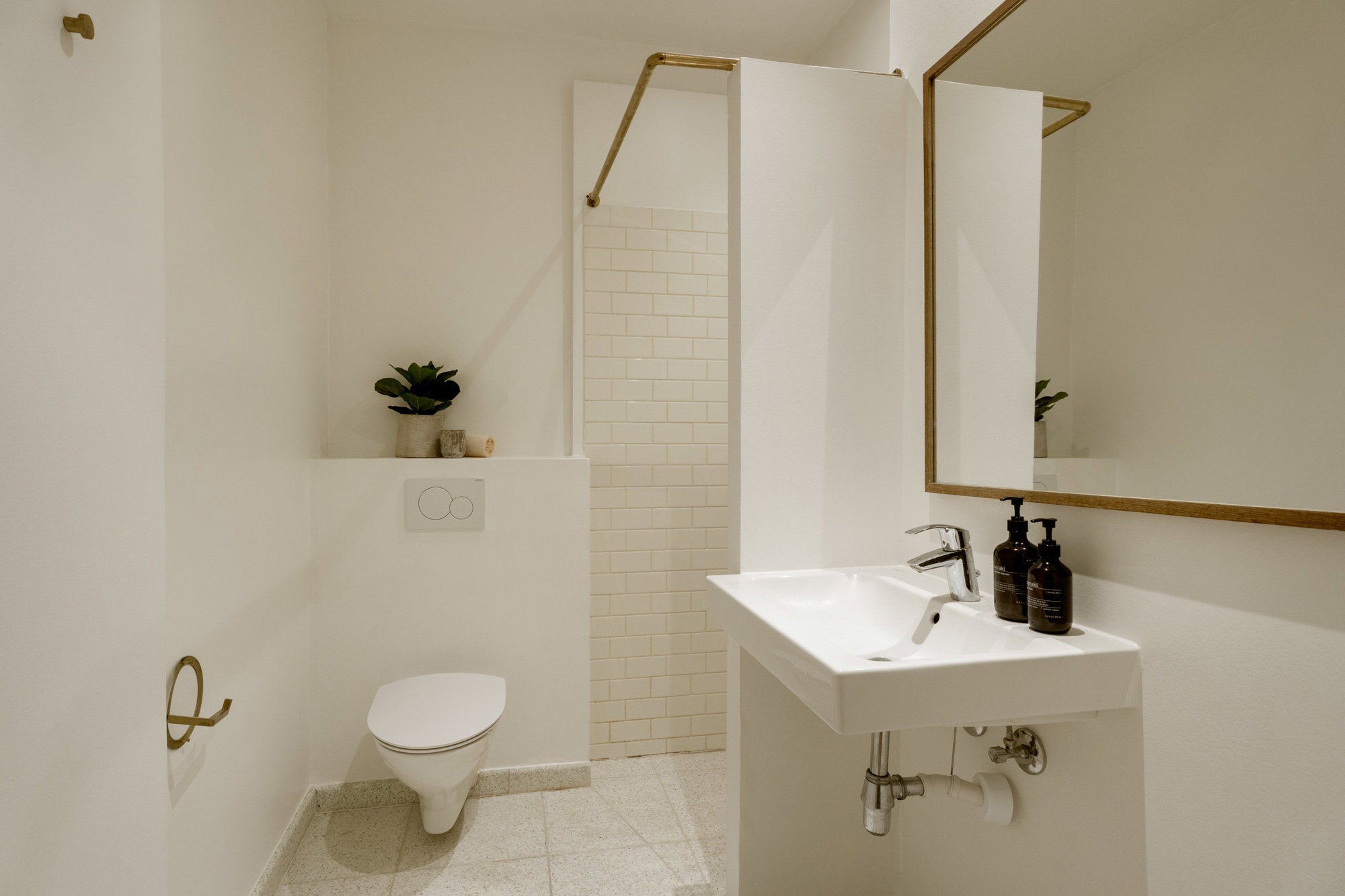 Badeværelset er indrettet med rene linjer, lyse overflader og elegante detaljer i varme metaller. Den minimalistiske styling fremhæver rummets funktionalitet og skaber et roligt, spa-inspireret udtryk. En stilfuld og tidssvarende indretning med fokus på kvalitet og æstetik.