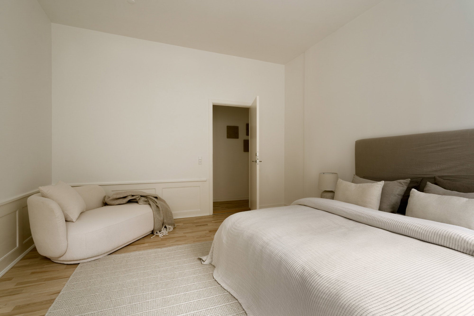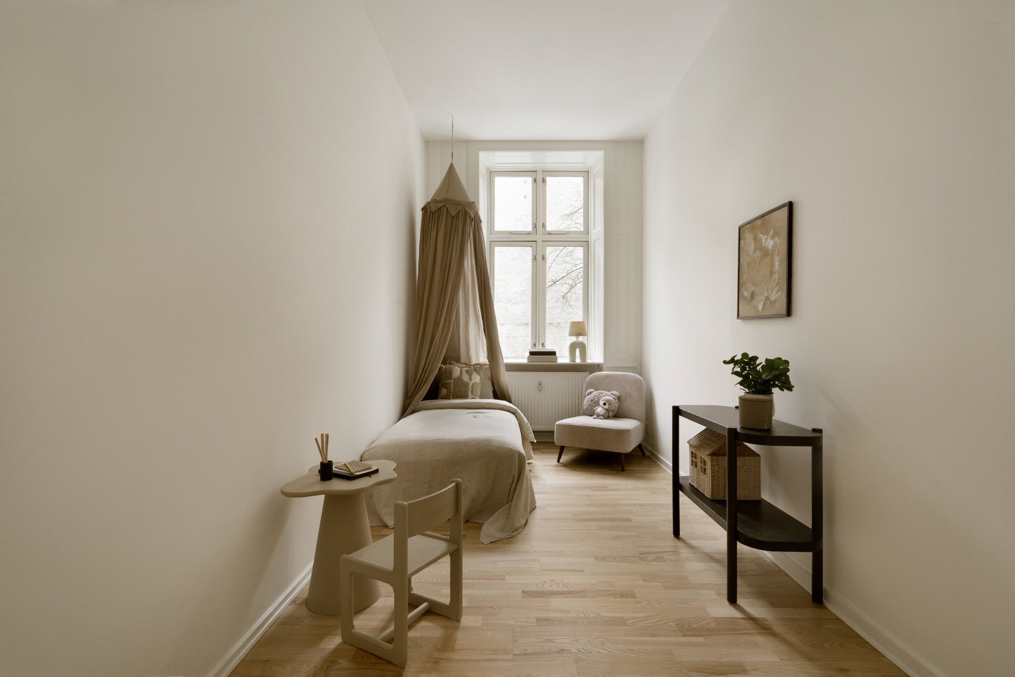 Børneværelset er stylet i lyse, neutrale toner med fokus på ro, enkelhed og funktionalitet. Bløde tekstiler, varme nuancer og nøje udvalgte detaljer skaber en tryg og harmonisk atmosfære. En stilren indretning, der giver rummet et let og indbydende udtryk med plads til både leg og hvile.
