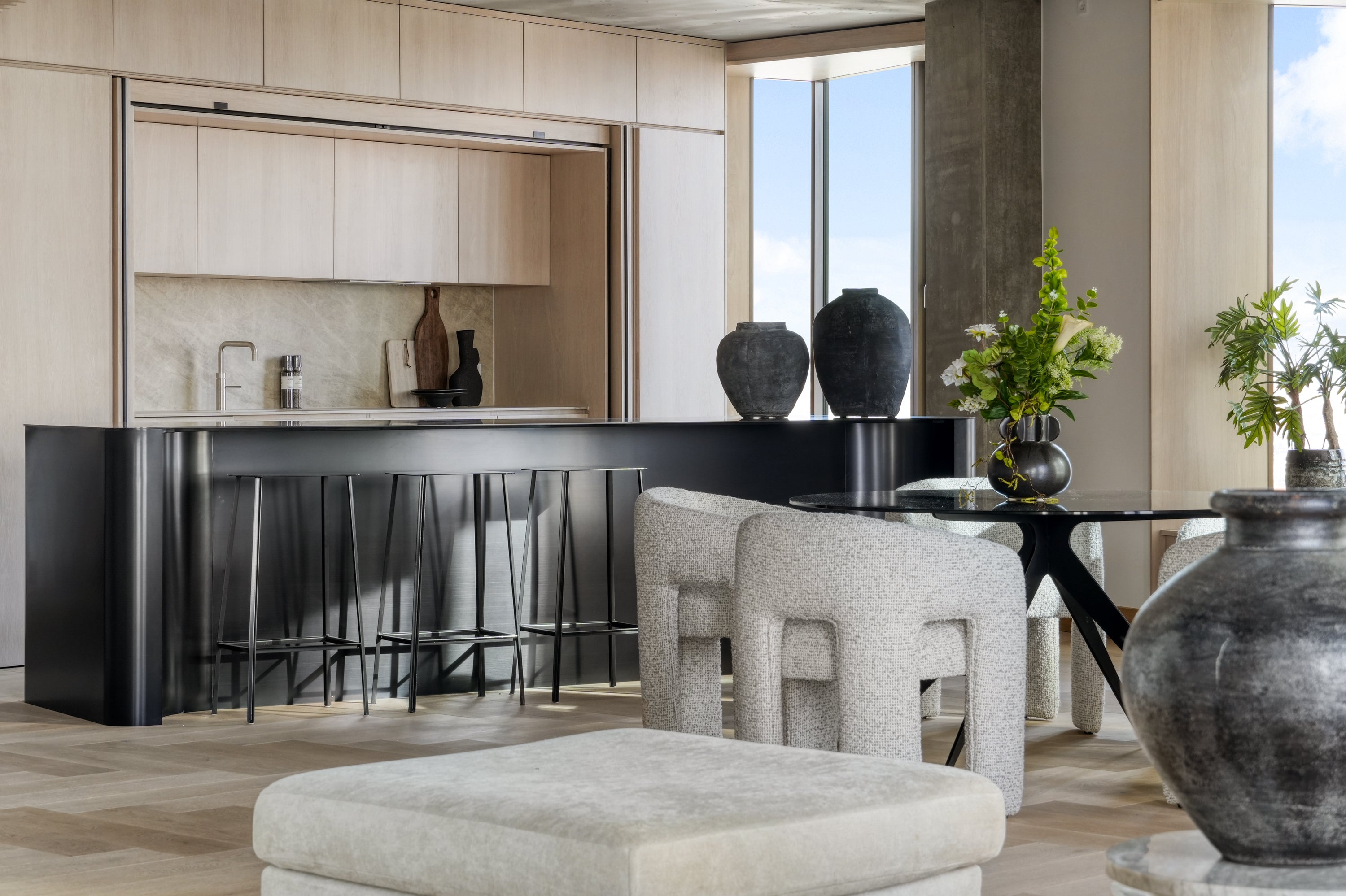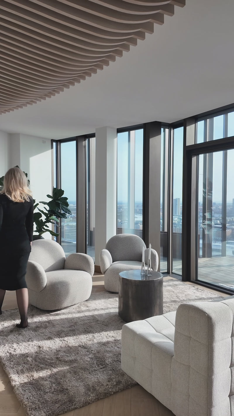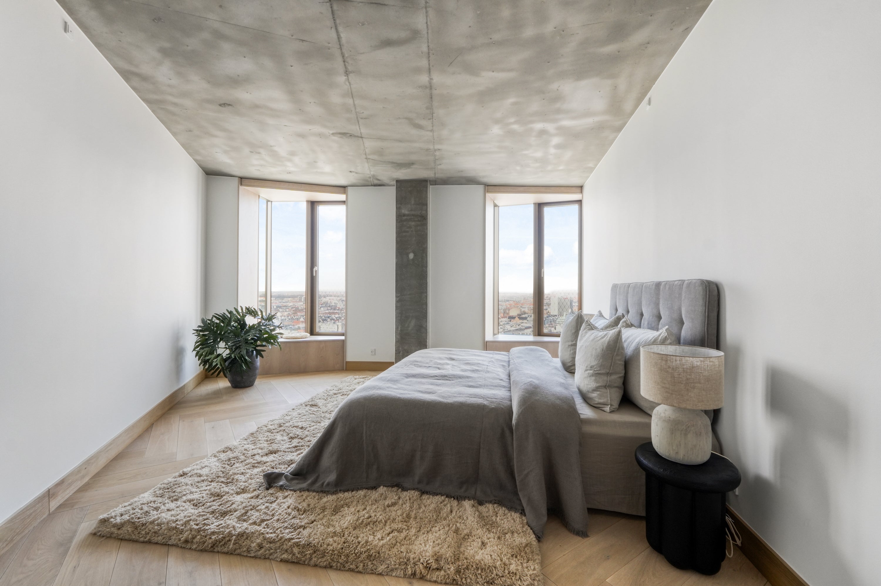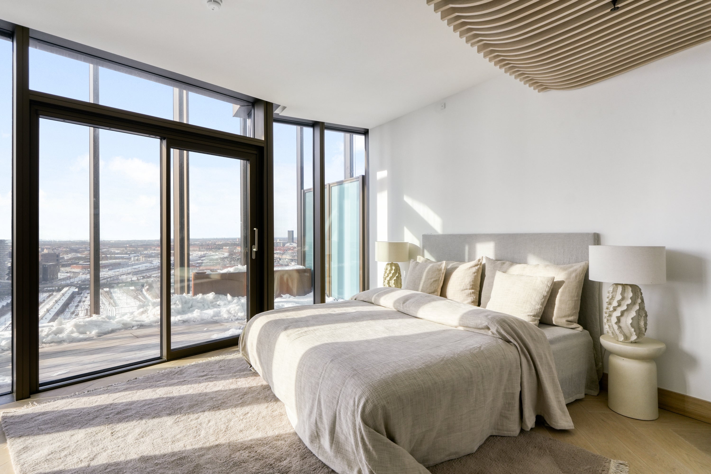 Et roligt og indbydende soveværelse, hvor vi har arbejdet med en afdæmpet farvepalette og bløde teksturer for at skabe en afslappende atmosfære. De store vinduespartier tilfører rummet et smukt lysindfald og understreger den imponerende udsigt, mens naturlige materialer og nøje udvalgte elementer binder rummet harmonisk sammen.