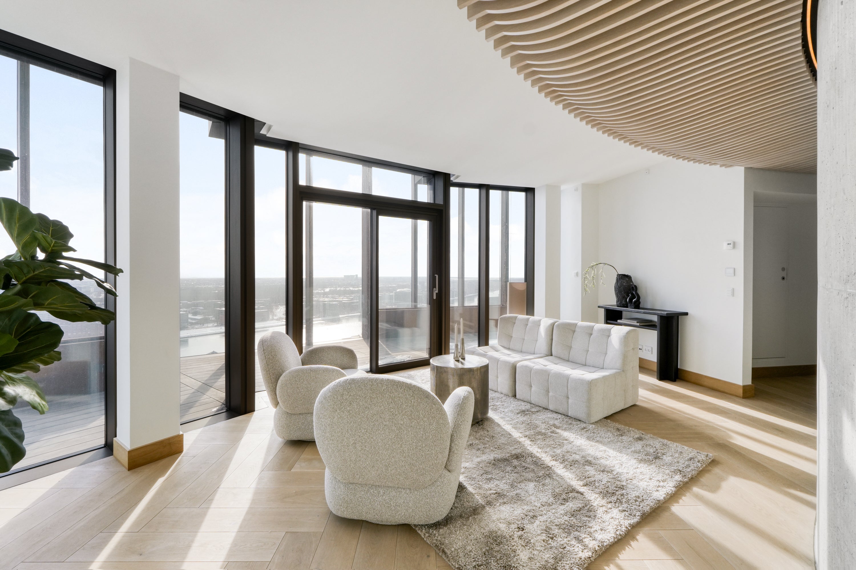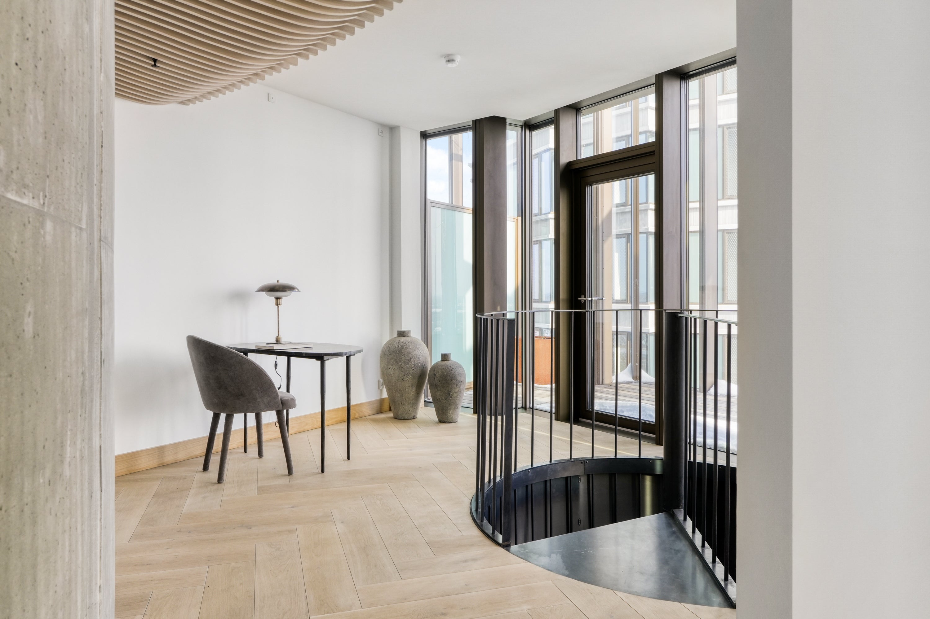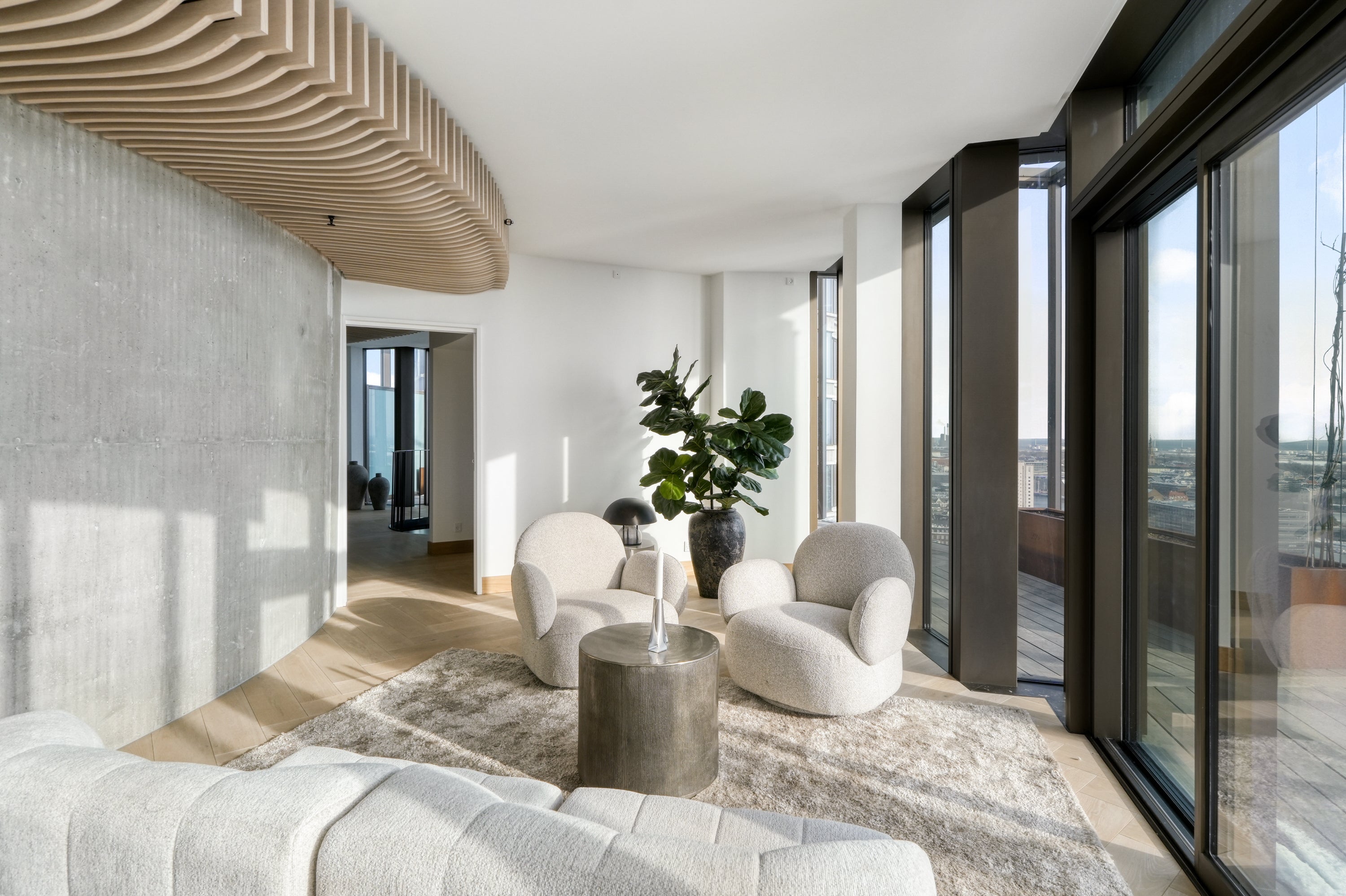 En enestående altan med en spektakulær udsigt over byen, hvor arkitekturen og de store glaspartier skaber en glidende overgang mellem inde og ude. De vertikale linjer og de varme materialer tilfører karakter, mens lys og luft giver en oplevelse af åbenhed og eksklusivitet.