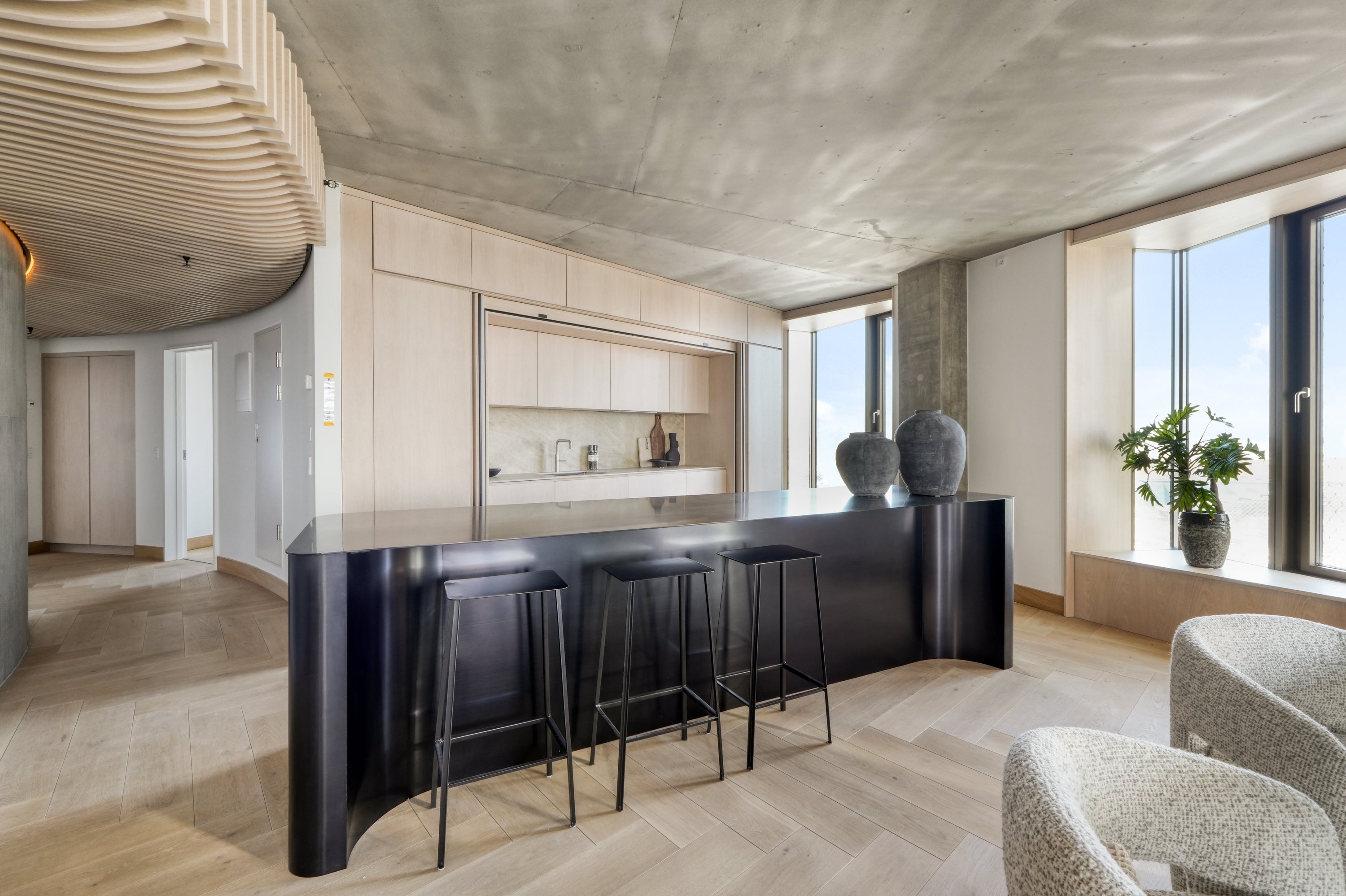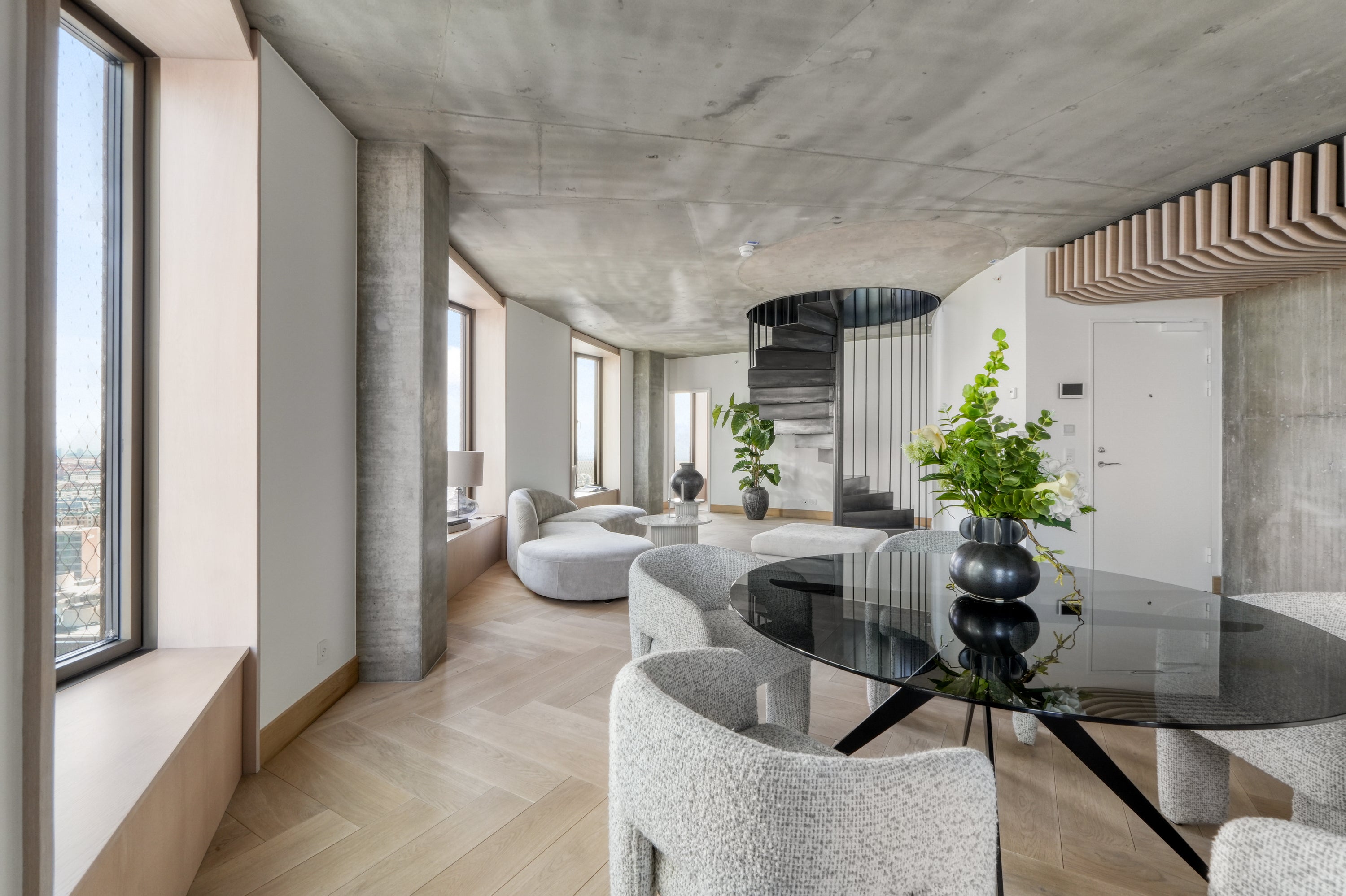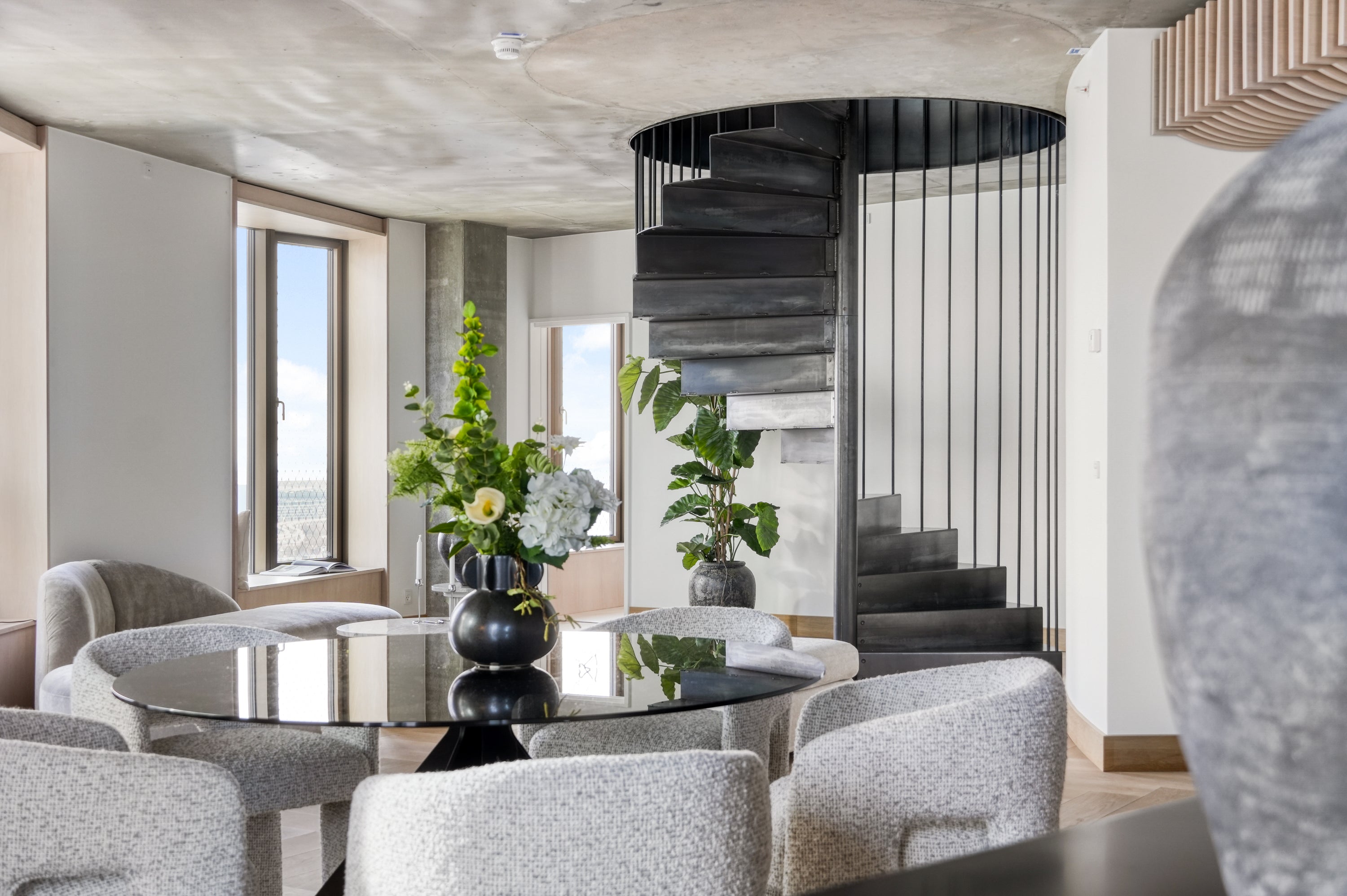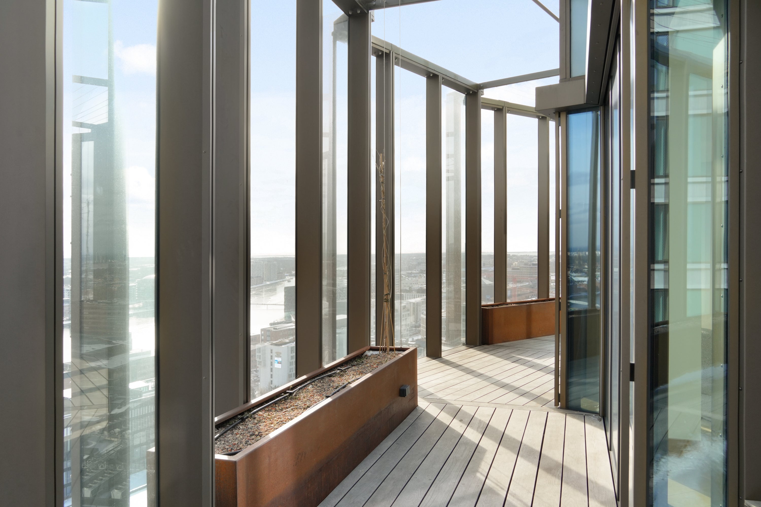 En enestående altan med en spektakulær udsigt over byen, hvor arkitekturen og de store glaspartier skaber en glidende overgang mellem inde og ude. De vertikale linjer og de varme materialer tilfører karakter, mens lys og luft giver en oplevelse af åbenhed og eksklusivitet.