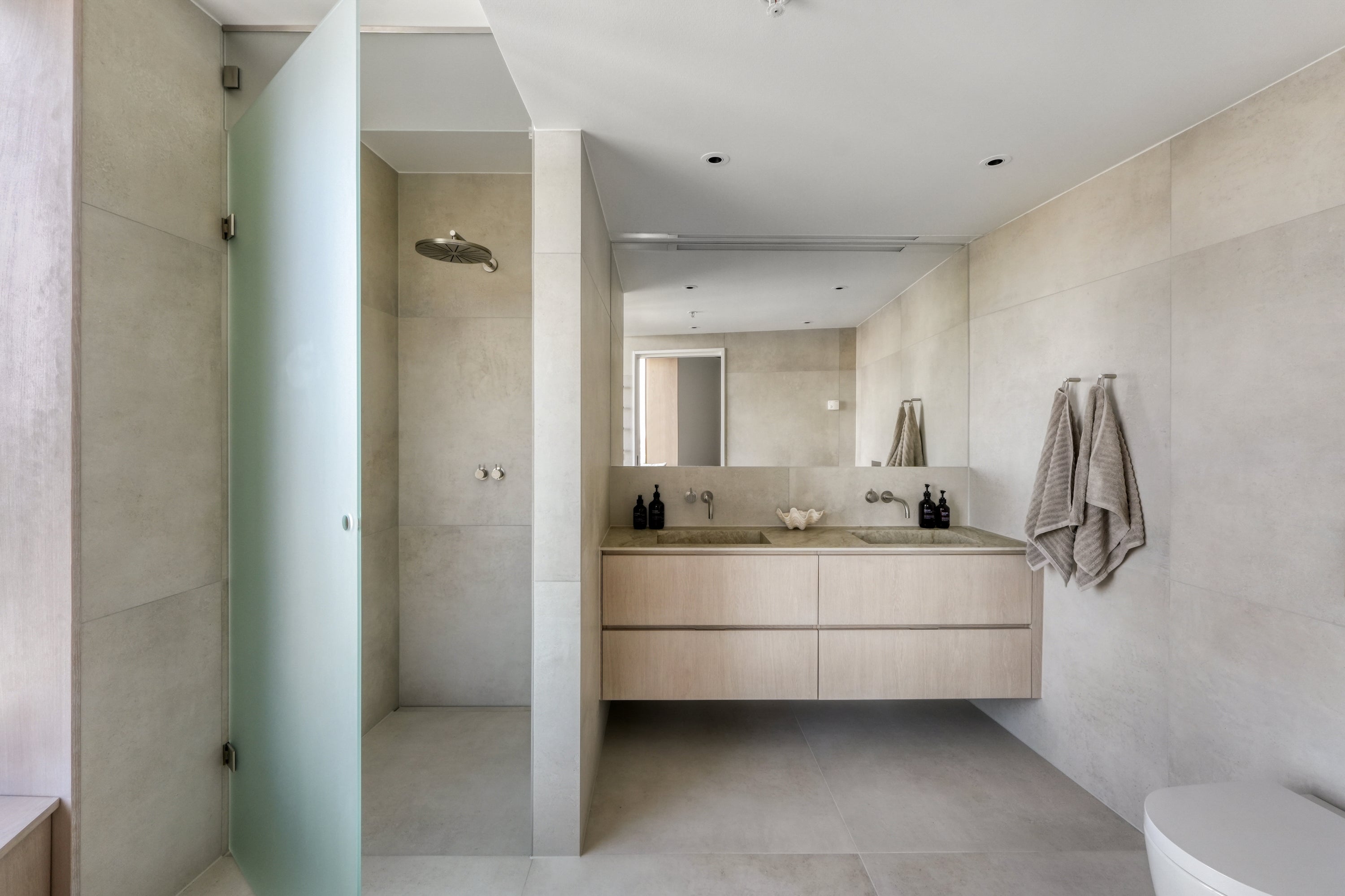 Et stilrent og eksklusivt badeværelse med rene linjer og en gennemført materialitet. De lyse nuancer og den enkle indretning skaber en følelse af ro og elegance, mens de integrerede løsninger og det minimalistiske design giver rummet et moderne og luksuriøst udtryk.