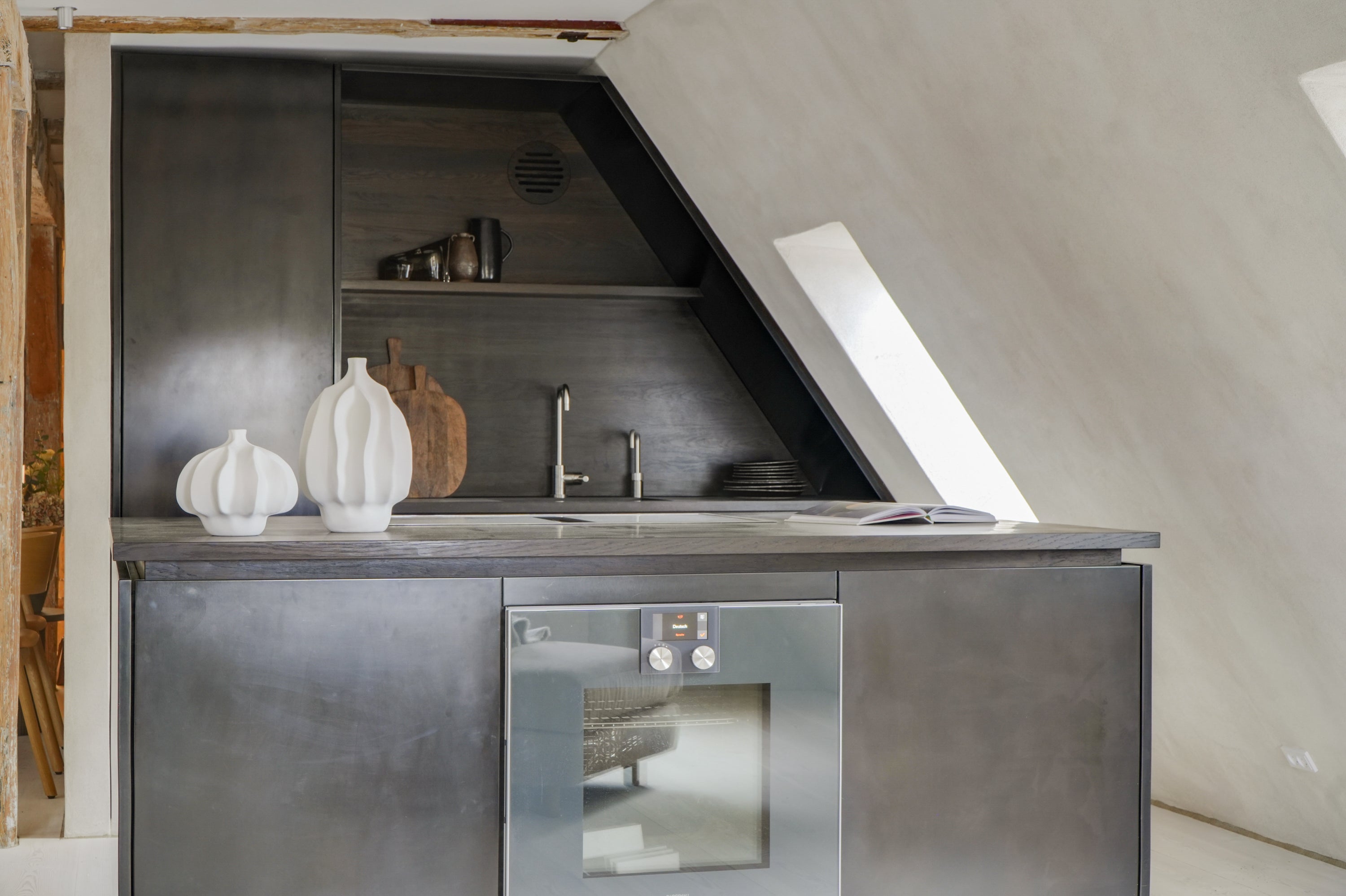 Køkkenet er holdt stilrent med få udvalgte detaljer, der tilfører liv til rummet. Enkle elementer skaber varme og balance, samtidig med at køkkenets rene linjer og funktionelle design bevares.