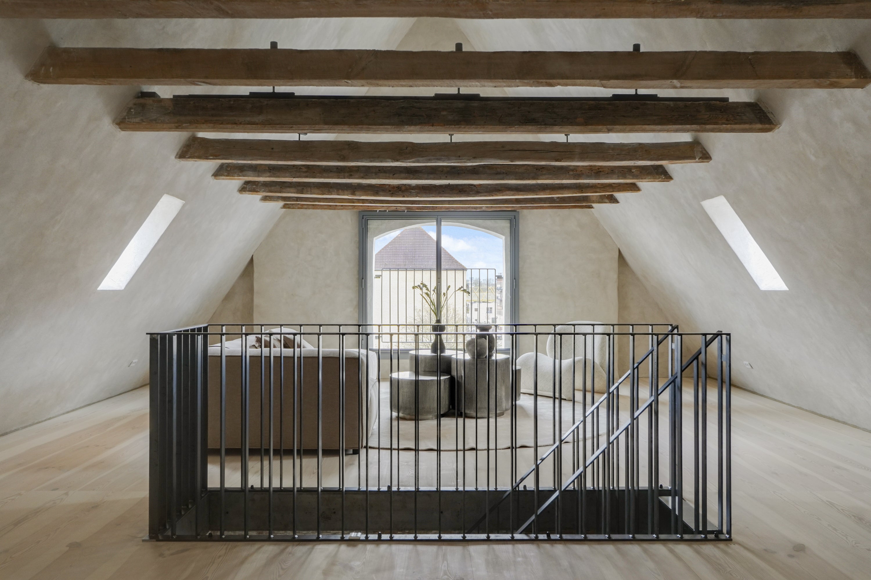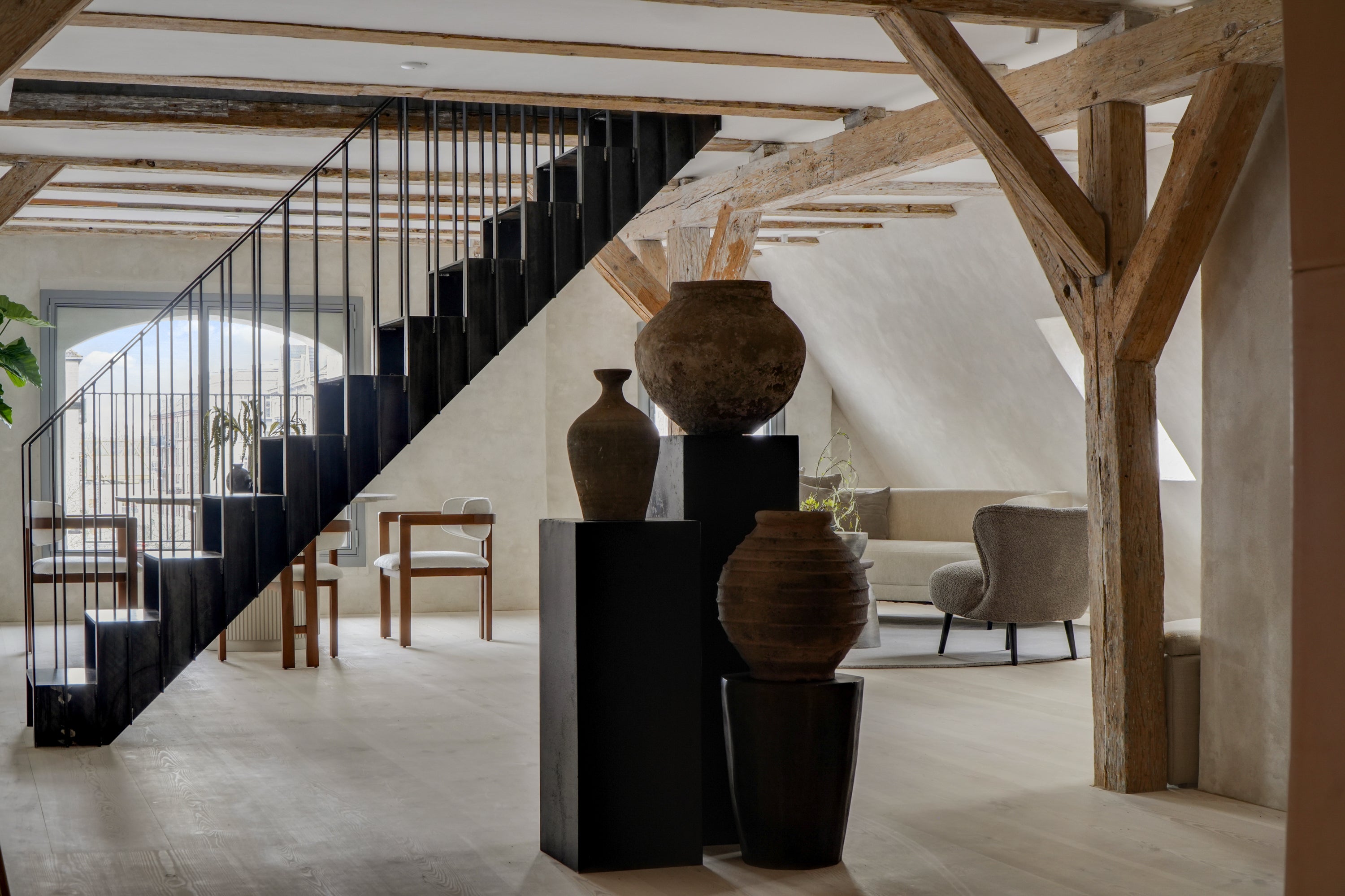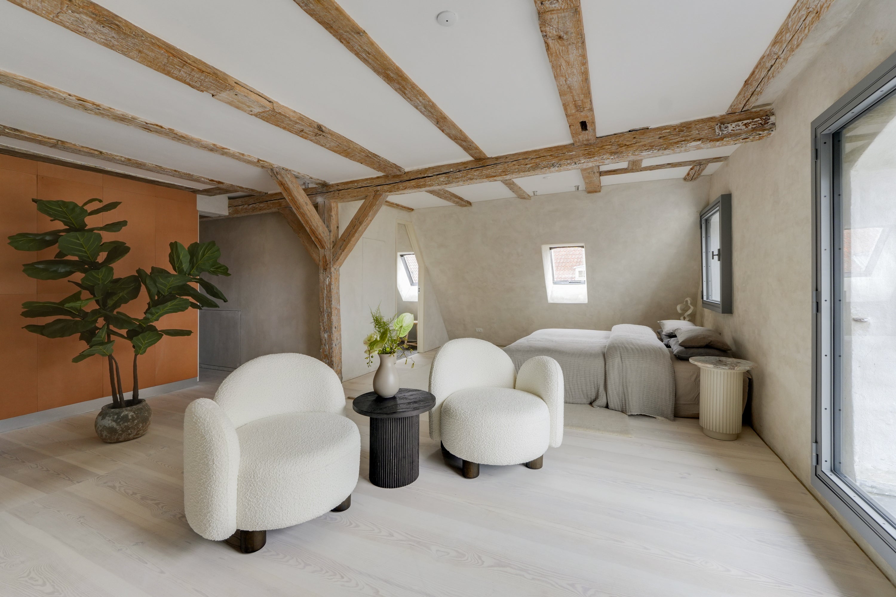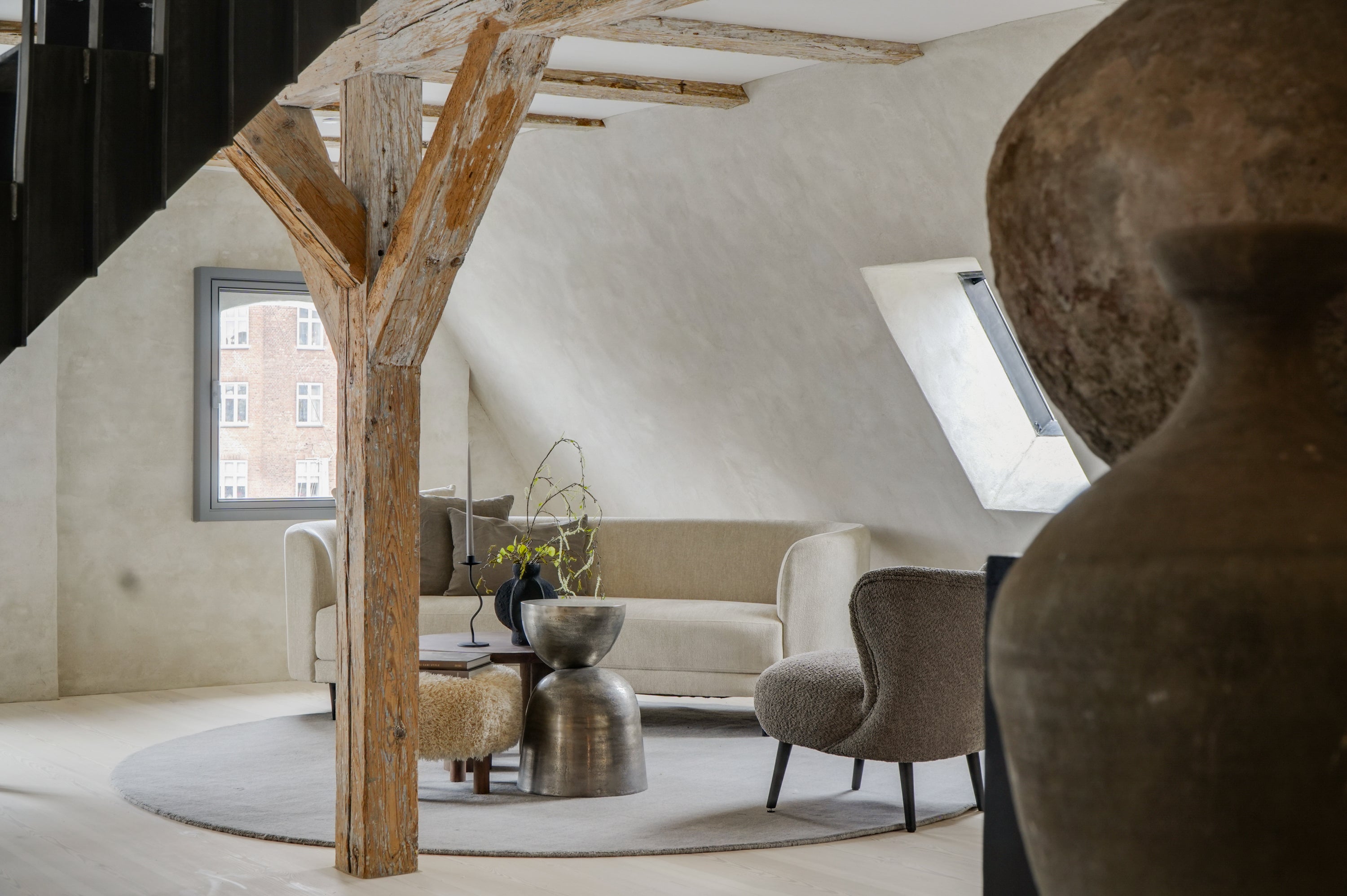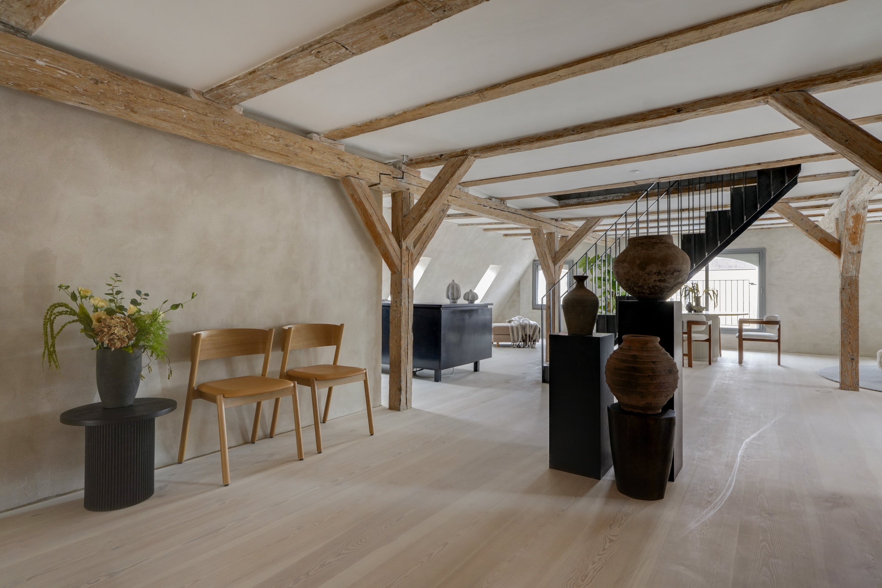 Indretningen er holdt i et minimalistisk udtryk, hvor enkle materialer og rene linjer skaber en rolig og moderne atmosfære.
