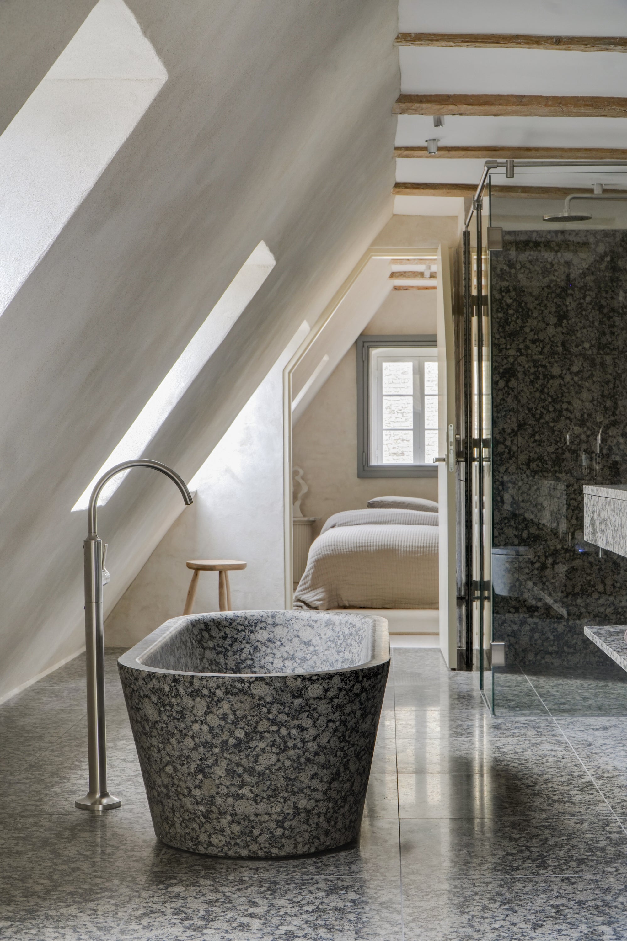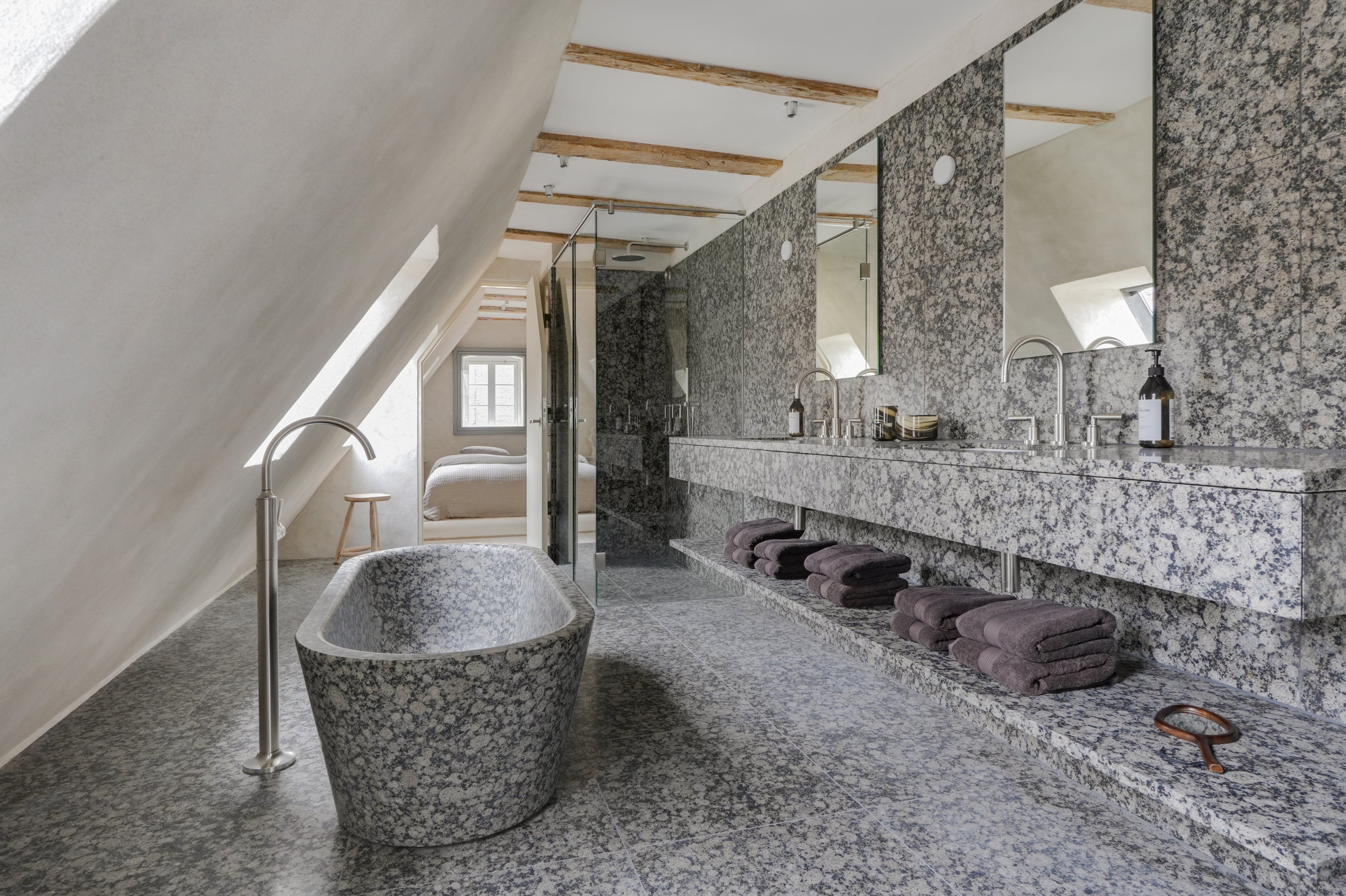 Badeværelset er stylet med fokus på en rolig overgang til soveværelset. Farver, materialer og teksturer går igen og skaber en harmonisk forbindelse mellem rummene, som giver boligen et sammenhængende og afbalanceret udtryk.